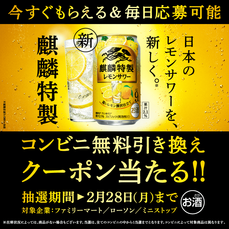 麒麟特製レモンサワーリニューアルを記念して、 コンビニ無料引換券を抽選でプレゼント🍋